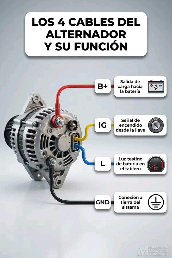 📌 En resumen: El alternador se conecta a la batería mediante el cable B+, se activa con la señal de encendido IG, informa al tablero con el cable L, y se estabiliza gracias a la tierra GND. Cada uno cumple un papel esencial para que el sistema eléctrico del vehículo funcione sin interrupciones.